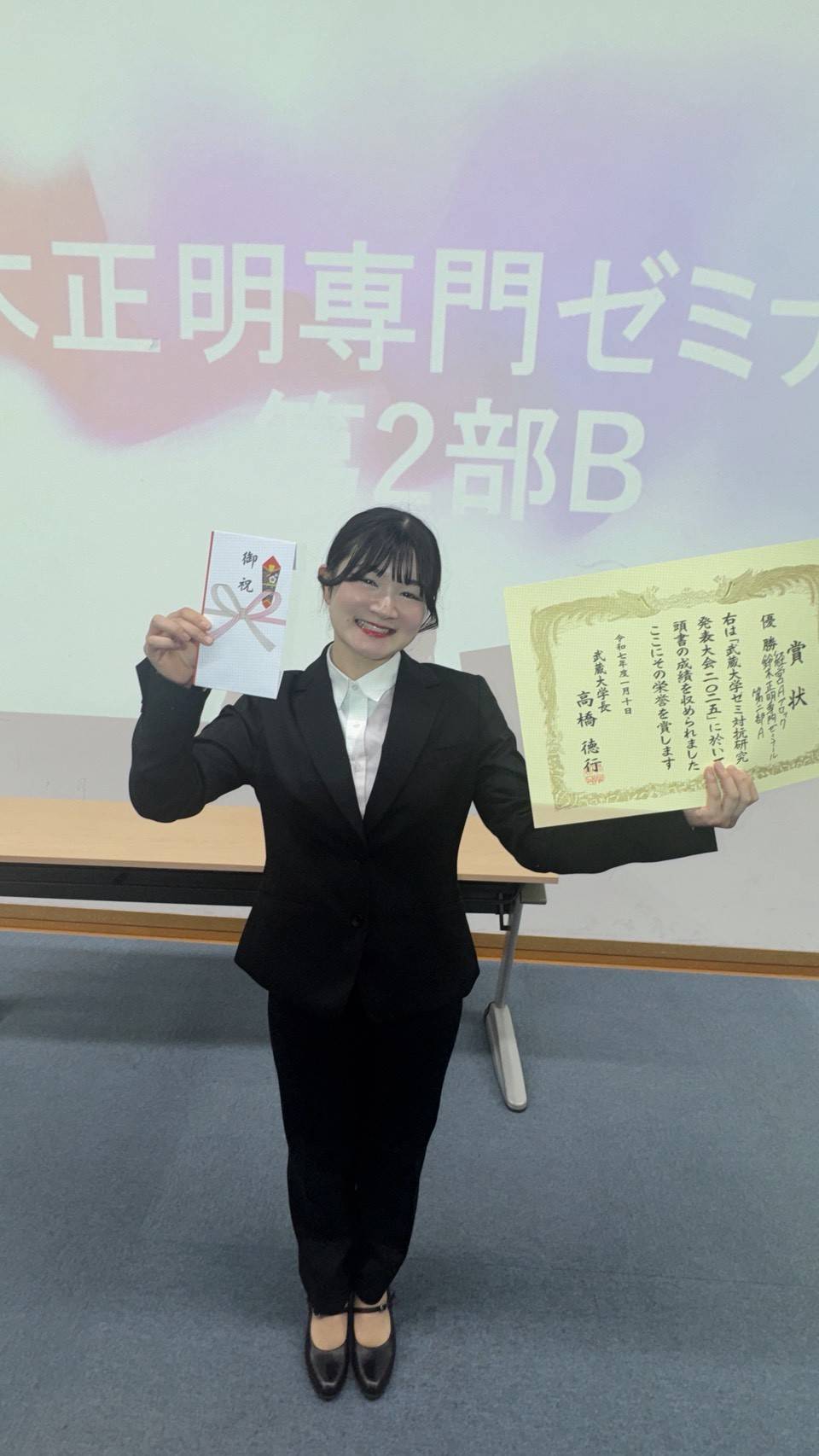 - At university's “Seminar Research Presentation Competition,” Yui Katori from Musashi University Faculty of Economics won the Grand Prize (first place) for her presentation on the theme “What Types of People Are Most Willing to Adopt Shelter Dogs?” Please check here for details.